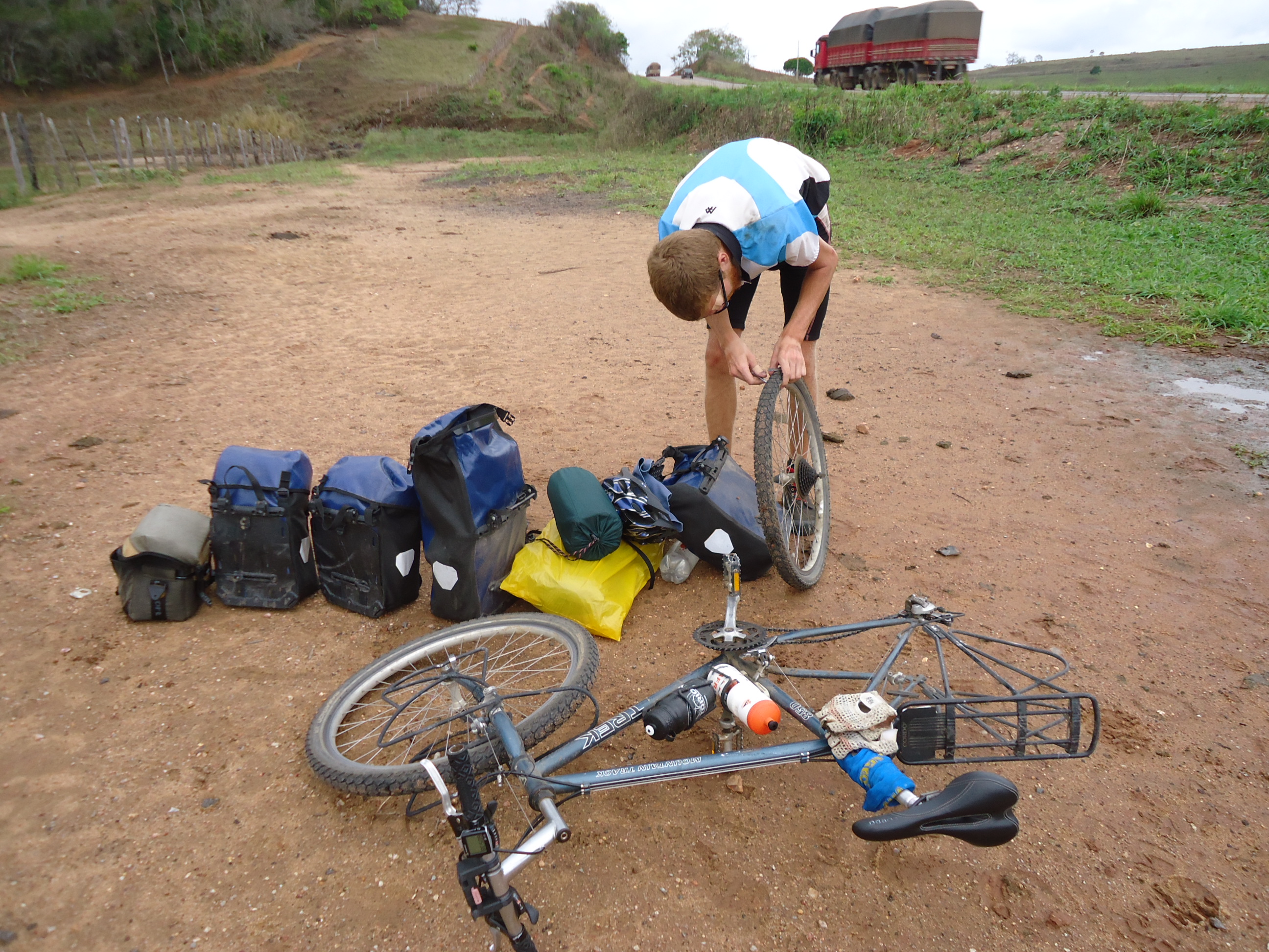 Op de 11e van de 11e is het dan zover. Gekkengetal is gekkenhuis. We fietsen zonder problemen dagen over hotseklotsezandweggetjes met scherpe steentjes, maar op de geasfalteerde staatsweg rijdt Tos eerst zomaar de goot in en gaat onderuit. De eerste valpartij. Met hier en daar een schaaf en kras kunnen we gelukkig door. Een half uurtje later hoor ik een sissend geluid en merk op dat het plastic om de tentzak weer eens tegen het wiel komt. Eenmaal stilstaand gaat dit geluid gewoon door. Het zal toch niet…?