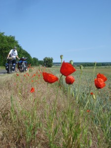 Dag #9: En ineens heb je 700km gefietst. 700! Elke dag noteren we het aantal kilometers, daar waar we slapen, wat we eten en welke benoemenswaardige plaatsjes we passeren. De eerste etappe: die naar Tours, zit er bijna op. Wanneer ik moe opsta en mijn knie (mijn linkerknie zeurt!) flink voel, dan lijkt deze eerste van de drie delen tot Santiago eeuwig te duren (zoals die van Saint Jaques, ofwel Jacobus de Meerdere, destijds waarschijnlijk). Maar schijnt de zon en fietsen we langs velden vol bloeiende klaprozen dan lijkt alles vanzelf te gaan!
